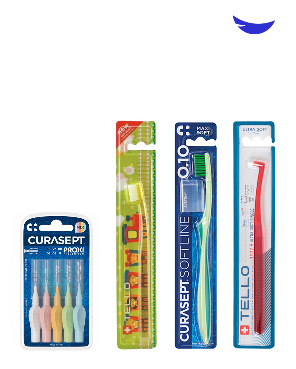 Podstawowy zestaw szkoleniowy do nauki prawidłowej techniki mycia zębów i pracy w przestrzeniach międzyzębowych. Z planem stosowania.