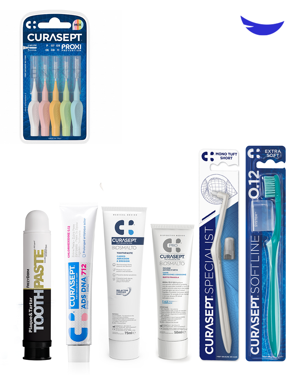 Kompleksowy zestaw do odbudowy szkliwa i kontroli biofilmu. Szczoteczki Curasept, Proxi Mix oraz pasty Biosmalto i ADS bez nadwrażliwości.